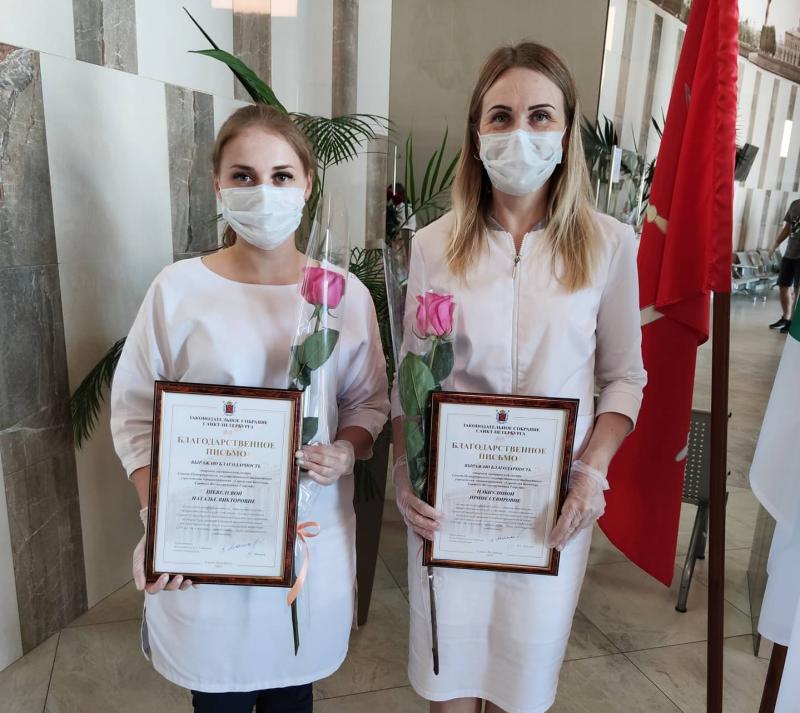 Затем началась церемония награждения. Врачи, медсестры, водители, диспетчеры — всего 31 сотрудник больницы Святого Георгия получили цветы и благодарственные письма от правительства города и Законодательного собрания. Напомним, это медицинское учреждение одним из первых переквалифицировали в инфекционную больницу для борьбы с COVID-19.